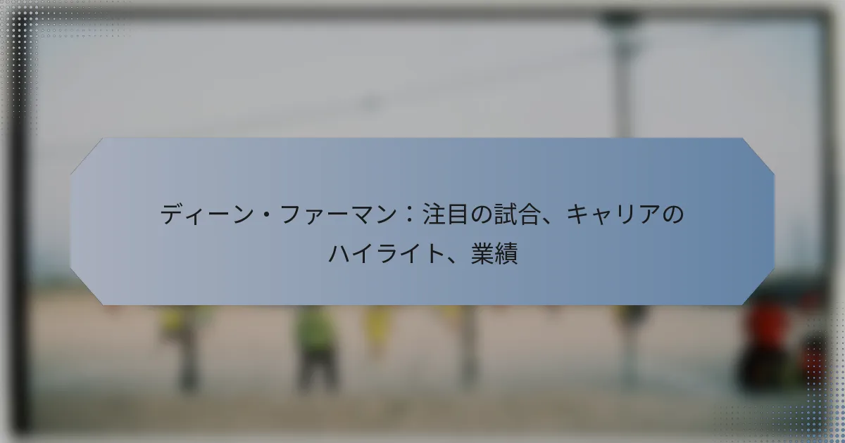 ディーン・ファーマンは、著名なプロサッカー選手であり、そのキャリアは注目すべき試合や重要な成果によって際立っています。クラブと国際レベルの両方での彼の貢献は、彼を重要なミッドフィールダーとして確立し、スポーツに対する彼のスキルと献身を示しています。ファーマンはその旅の中で数多くのタイトルや賞を獲得し、南アフリカのサッカー界での評判を固めました。 ディーン・ファーマンのサッカーキャリアにおける注目すべき試合は何ですか? ディーン・ファーマンは、彼の評判やパフォーマンスに大きな影響を与えた注目すべき試合をいくつか経験しています。彼の重要な試合は、クラブと国際レベルの両方にわたり、彼が代表したチームへの貢献とスキルを示しています。 彼のキャリアを定義した重要な試合 ファーマンのキャリアは、ミッドフィールダーとしての彼の能力を際立たせるいくつかの重要な試合によって特徴づけられています。最も注目すべき試合の一つは、2013年のアフリカネイションズカップでの彼のパフォーマンスで、南アフリカが準々決勝に進出する過程で重要な役割を果たしました。 もう一つの重要な試合は、彼がクラブチームに在籍していた際のもので、リーグプレーオフでの重要な勝利を確保するのに貢献し、フィールド上でのリーダーシップと戦術的な意識を示しました。 2013年アフリカネイションズカップ:マリとの準々決勝。 2014年ワールドカップ予選:ボツワナとの重要な試合。 2015年リーグプレーオフ:彼のクラブの昇格につながる決定的な試合。 国際大会での記憶に残るパフォーマンス ファーマンは、特に南アフリカ代表としての出場時に、さまざまな国際大会で記憶に残るパフォーマンスを発揮しています。彼のミッドフィールダーとしてのボールコントロールと効果的な配球能力は、いくつかの試合で重要な役割を果たしました。 2015年のアフリカネイションズカップでは、セネガルとの試合でのファーマンのパフォーマンスが特に注目され、彼は守備と攻撃の両方で貢献し、強敵相手に引き分けを確保するのに役立ちました。 重要なクラブ試合とその結果 クラブキャリアを通じて、ファーマンはチームの順位に影響を与える数多くの重要な試合に参加してきました。イングランドリーグのクラブでの彼の在籍中には、プレーオフの位置を決定する重要な試合に関与しました。 特に目立つ試合は、ダンカスター・ローバーズに在籍していた際のもので、決定的なゴールを決めて重要な勝利をもたらし、FAカップの次のラウンドへの進出を確保しました。 FAカップの試合:ダンカスター・ローバーズ対シェフィールド・ユナイテッド – ファーマンが勝利のゴールを決めた。 リーグ戦:プレーオフ進出を確保したウィガン・アスレティックとの重要な試合。 目立った試合からの統計 ファーマンの目立った試合は、彼の統計に反映されており、ピッチ上での効果的なパフォーマンスを示しています。いくつかの試合では、彼は80%を超える高いパス精度を達成しており、ボール保持において重要です。 さらに、彼の守備への貢献も注目されており、試合ごとに数回のタックルやインターセプトを記録しており、プレーメーカーとディフェンダーの二重の役割を示しています。 注目すべき試合が彼の評判に与えた影響 ディーン・ファーマンのキャリアにおける注目すべき試合は、彼の信頼できるミッドフィールダーとしての評判を大きく形作っています。重要な試合での彼のパフォーマンスは、チームメイトや対戦相手からの尊敬を得ており、重要な瞬間におけるキープレイヤーとしての地位を確立しています。 その結果、ファーマンはプレッシャーの中でパフォーマンスを発揮する能力で知られるようになり、より高いリーグや国際大会での機会を得ることにつながり、彼のキャリアの展望をさらに広げました。 ディーン・ファーマンのキャリアの主なハイライトは何ですか? ディーン・ファーマンは、重要な成果やさまざまなチームへの貢献によって特徴づけられる著名なプロサッカーキャリアを持っています。彼の旅には、重要なマイルストーン、影響力のある移籍、そしてミッドフィールダーとしてのスキルを示す一連の記憶に残る試合が含まれています。 ディーン・ファーマンのプロフェッショナルな旅のタイムライン ディーン・ファーマンのプロキャリアは、2010年代初頭に南アフリカのクラブ、ビドベスト・ウィッツでデビューしたことから始まりました。その後、彼はヨーロッパに移り、イングランドのダンカスター・ローバーズやスコットランドのレンジャーズなどのクラブでプレーしました。キャリアを通じて、ファーマンは南アフリカ代表としても出場し、多くのキャップを獲得し、主要な大会に参加しました。 ファーマンのキャリアは、イングランドフットボールリーグやスコットランドプレミアシップなど、さまざまなリーグを通じての移行を見てきま